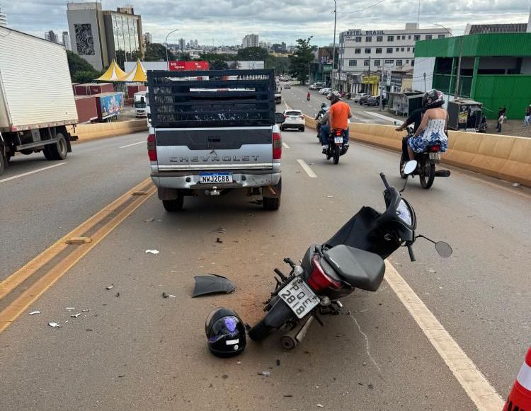 Um acidente de trânsito envolvendo uma caminhonete e uma motoneta deixou uma mulher ferida na manhã desta terça-feira (7), em cima do viaduto da Avenida Brasil Sul, na região da Vila Jussara, em Anápolis.